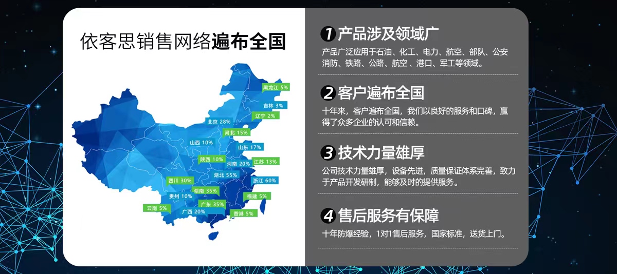 依客思防爆專注于防爆產(chǎn)品的研發(fā)、生產(chǎn)與銷售,主要產(chǎn)品有:防爆操作柱、BXCQ防爆靜電釋放儀、BZC系列防爆操作柱、不銹鋼現(xiàn)場操作箱、BXM(D)防爆照明(動力)配電箱、BXX防爆檢修箱、BXJ防爆接線箱、LED防爆燈、防爆管件、防爆風(fēng)機(jī)等產(chǎn)品,型號規(guī)格齊全,廣泛適用于煤炭、電力、醫(yī)藥、石油、化工、航空等領(lǐng)域。我公司產(chǎn)品質(zhì)量過硬,價格實(shí)惠,銷售范圍廣,且與各大型企業(yè)建立了良好的合作關(guān)系,同時還遠(yuǎn)銷中、東亞和北美等地區(qū),深受用戶喜愛與青睞。